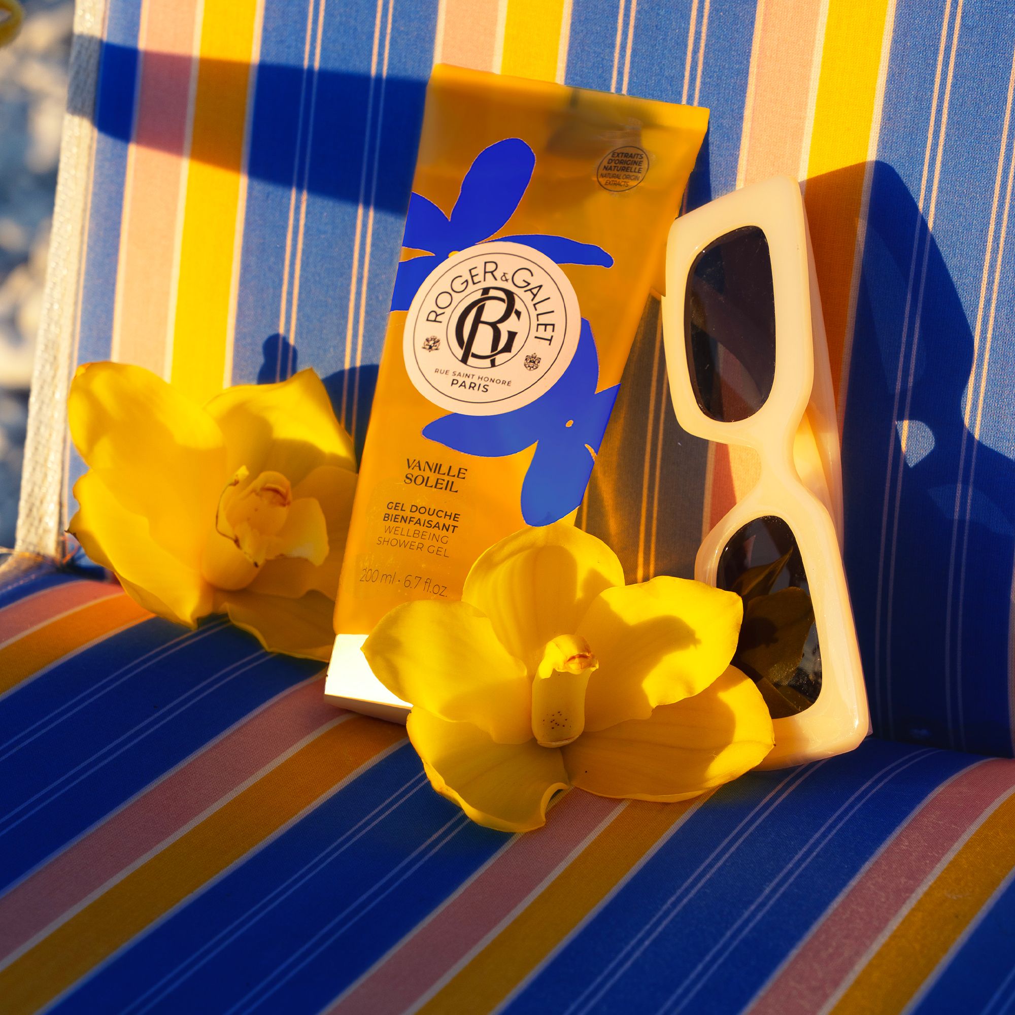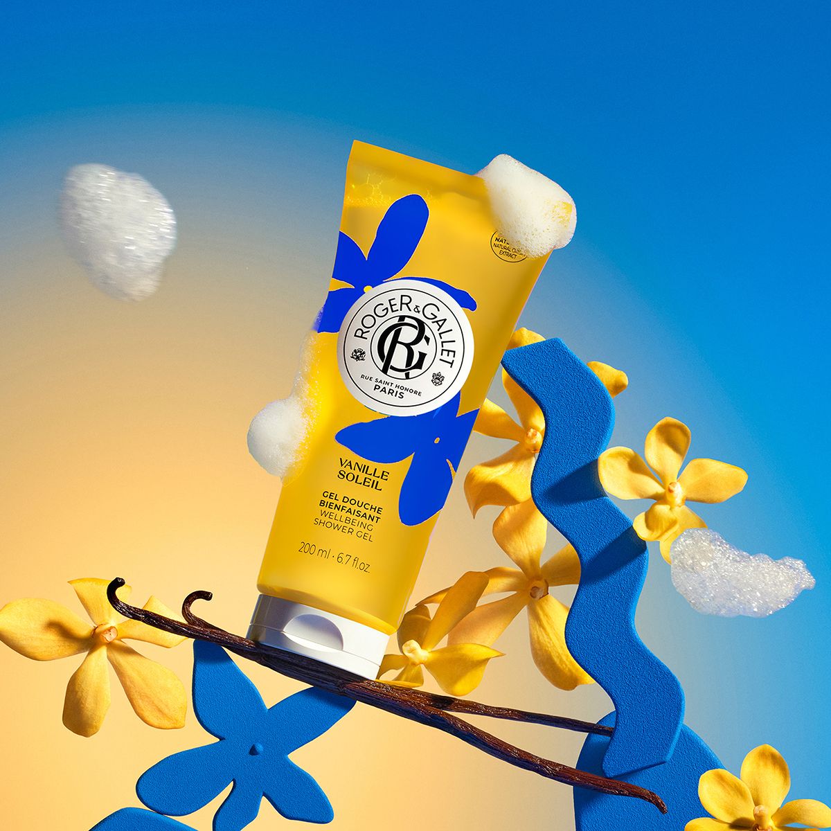 Addictive vanilla, sunny white flowers and saline notes on an amber base... Vanille Soleil Shower Gel infuses the skin with sunny and delicious notes, for a beach-return effect! Its formula enriched with aloe vera and natural vanilla extract leaves the skin soft and hydrated. Generous, its fine foam awakens the senses for a feel-good moment under the shower. Roger's tip: pair it with your perfume to extend your fragrance trail. - Vegan formula - 100% plant-based cleansing base - Suitable for sensitive skin - Made in France